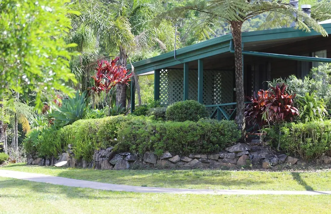 Die Eungella Cabins verfügt über Parkplätze und eine sonnige Terrasse mit Aussicht auf die Berge.